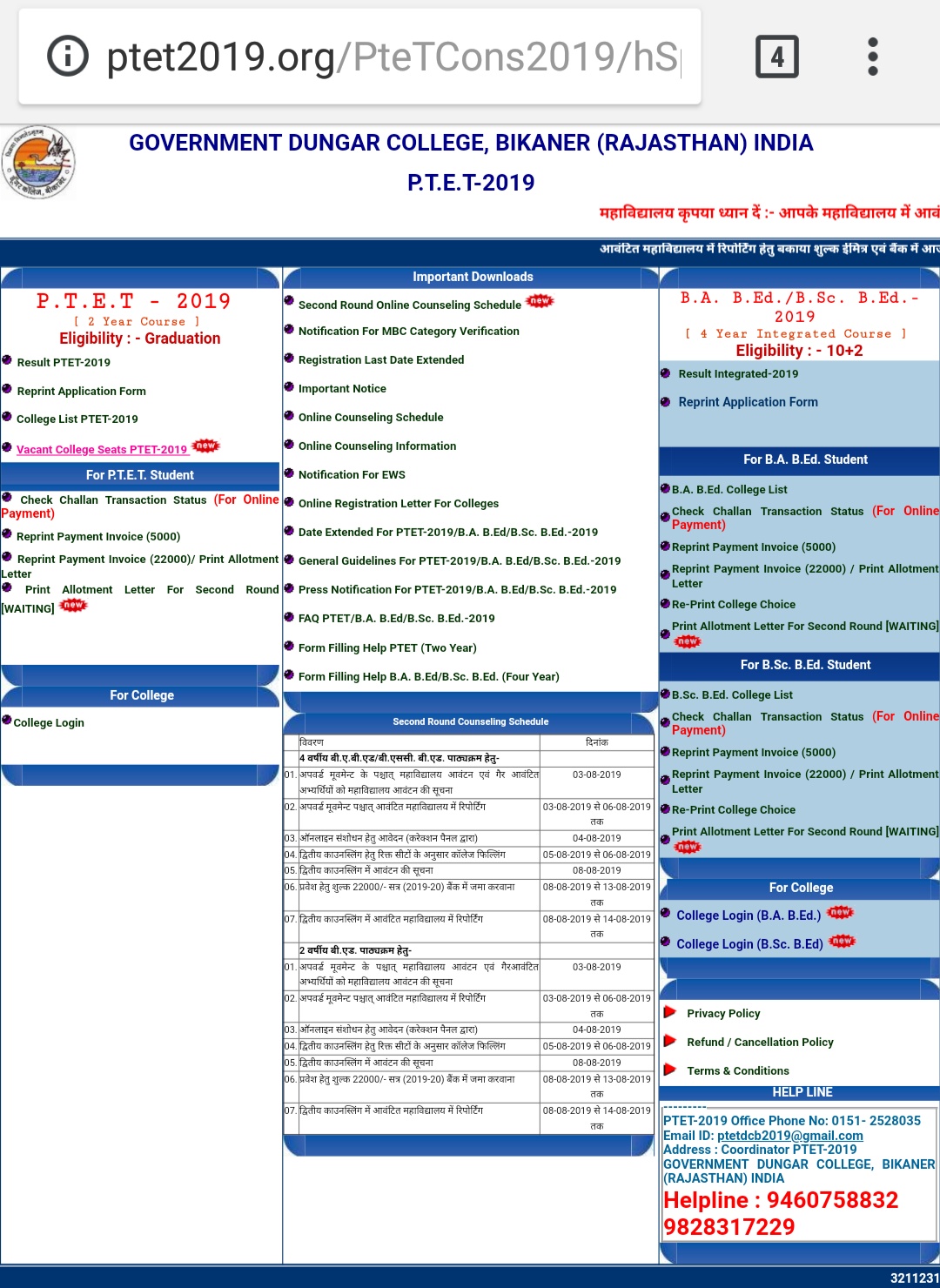 श्री डूंगर महाविद्यालय द्वारा आयोजित PTET 2019 परीक्षा के माध्यम से 2nd चरण की काउंसलिंग में 5 एवं 6 अगस्त 2019 काउंसलिंग के माध्यम से चयन किये गए कॉलेज के आधार पर अब श्री डूंगर महाविधालय ने 2 वर्षीय BED एवं 4 वर्षीय इंटीग्रेटेड कोर्स के लिए अभ्यर्थियों के 2nd चरण में कॉलेजों के आवंटन कर दिया है।